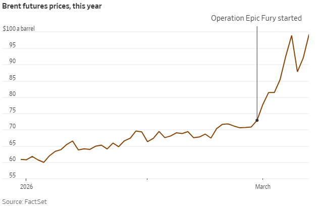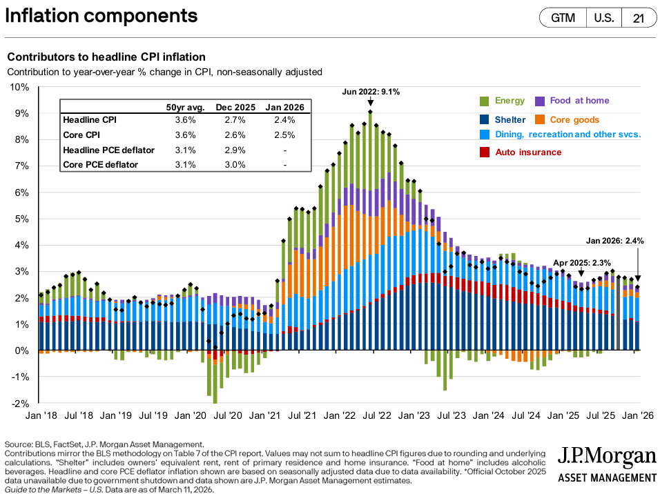 Getting inflation below 4%, then 3%, was a hard-fought battle that inflicted pain in investors. Note the green marked “energy” was a huge contributor to inflation and eventually became a contributor to disinflation starting in 2023. The last inflation report showed the inflation rate held at 2.4%, which is great news for the economy, though it comes amid a spike in oil prices due to the military actions in Iran. See the change in oil prices below: